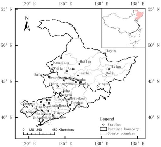 The three provinces used in this study, i.e., Liaoning, Jilin, and Heilongjiang are located in northeastern China and have a temperate continental monsoon climate with four distinct seasons, rain and heat in the same season, and an annual average temperature range of −4 °C to 11 °C. The annual precipitation is 371–1084 mm, and around 80% of the total precipitation occurs in July-August. The annual sunshine hours range from 2219 h to 2952 h, and the heat conditions are suitable for one crop a year. The area is an important commercial grain production base in China and the land is mainly used to grow maize, rice, soybean, and spring wheat. Although the rain and heat in this area occur in the same season, the spatial and temporal distributions for precipitation are uneven and the evapotranspiration rate is high. Seasonal droughts, such as spring drought and spring and summer drought, often occur in the maize growing season, and there are clear regional droughts, which are, mainly distributed in the western part of northeast China [,]. Figure 1 shows the spatial distribution of agro-meteorological observation stations in northern China.