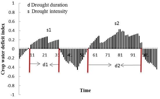The duration and intensity of agricultural drought events were extracted from the CWDIwp series using run theory. Drought duration and intensity are shown in Figure 2. Drought intensity represents the drought degree of crops, and is the result of both the degree and duration of a crop water deficit. Taking 0 as the interception level, the period when the CWDIwp > 0 is defined as drought duration, and the cumulative CWDIwp during the drought duration is defined as the drought intensity S (Equation (6)).