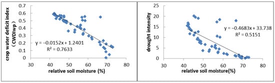 As can be seen from Figure 3, the CWDIwp, drought intensity, and relative soil moisture content had significant negative correlations. The lower the relative soil moisture content, the more severe the crop water deficit and the stronger the drought severity.