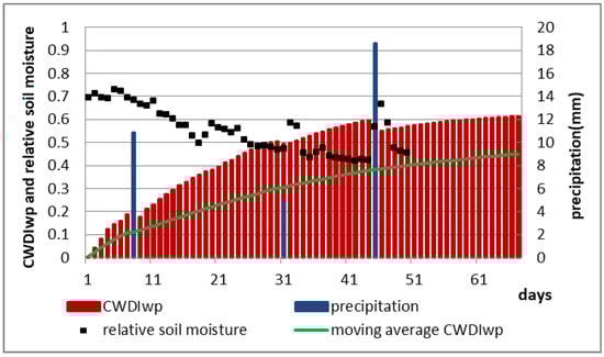In 2006, Fuxin experienced a continuous drought event during summer and autumn. As shown in Figure 4, the drought began on 13 July. When the CWDIwp reached 0.48, the drought intensity was 7.5, and when the drought event was 27 days old it entered a moderate drought period, during which three precipitation events (34.38 mm in total) were recorded. However, the relative soil moisture content fluctuated between 40 and 50%. When the maize reached maturity, the CWDIwp was 0.61 and the drought intensity was 30.2, which lasted for 67 days and resulted in a yield reduction rate of 23.9%, suggesting a severe drought event.