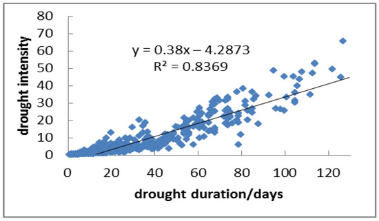 Relationship between drought duration and drought intensity at the 15 meteorological stations in Liaoning Province, China.