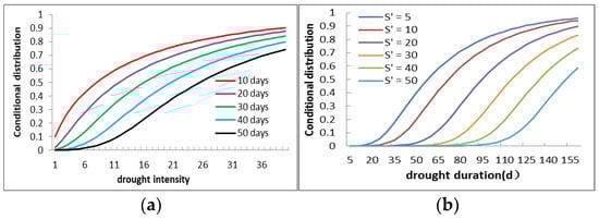 Figure 6a,b shows the conditional probability distribution for different drought intensity and drought duration thresholds at Fuxin Station, respectively. The conditional probability for drought intensity (drought duration) decreased with the increase in drought duration threshold (d’) (drought intensity threshold is represented by s’). When the given drought duration is ≥20 days, the probability of a drought intensity ≤10 is 56% and when the drought duration is ≥30 days, then the probability of a drought intensity ≤10 is 30%. When the given drought intensity is ≥10, the probability that the drought lasted ≤30 days is 2.2%, but when the drought intensity ≥20, the probability that the drought lasted ≤30 days is 0.17%.
