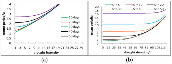 Figure 7a,b shows the recurrence period for a given drought intensity and drought duration thresholds at Fuxin Station, respectively. The recurrence period for drought intensity (drought duration) increases with the increase in drought duration threshold. When the drought duration ≥20 days and the drought intensity is ≥10, then the recurrence period for drought events is 2.3 years and when the drought duration is ≥30 days and the drought intensity is ≥10, then the recurrence period for drought events is 2.4 years. When the drought intensity ≥20 and the drought duration is ≥20 days, then the recurrence period for drought events is 4.07 years, but when the drought intensity ≥30 and the drought duration is ≥20 days, the recurrence period for drought events is 6.68 years.