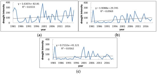 Temporal variations in drought intensity in Liaoning (a), Jilin (b), and Heilongjiang (c) from 1981 to 2020.