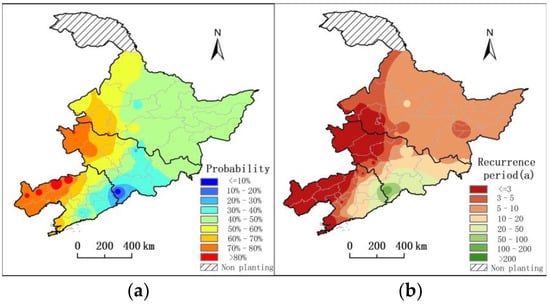 Spatial distributions of the agricultural drought event joint probabilities and the co-occurrence recurrence periods in Northeast China from 1981 to 2020. (a) Probability; (b):recurrence period.