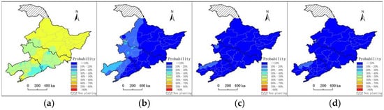 Spatial distributions of the joint probabilities for agricultural drought events with different drought grades in Northeast China from 1981 to 2020. (a) Light drought; (b) moderate drought; (c) Severe drought; (d) Extreme drought.