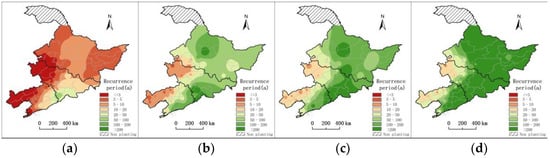 Spatial distribution of the co-occurrence-recurrence periods for agricultural drought events of different severity in Northeast China from 1981 to 2020. (a)Light drought; (b) moderate drought; (c) severe drought; (d) extreme drought).