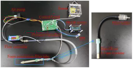 Figure 3 shows the designed control circuit board. The pressure sensor installed on the circuit board was connected to the outlet of PM2.5 sampling device (foam penetration-filter tube/cyclone-filter holder) through tubes and a “Y” connector to record the pressure response in real time. In the preliminary experiment, the pressure drop generated by porous foam or cyclone was minuscule. This phenomenon was also observed in the previous study [30], where the differential pressure of porous foam was less than four percent of the total pressure increase for mass loading. For this reason, the pressure at the outlet of foam penetration-filter tube or cyclone-filter holder is regarded as the differential pressure of filter, which allows simplifying the setup of the monitoring system.