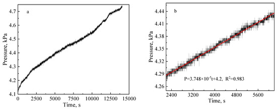 Figure 4 shows the variation of the measured pressure drop with time during PM2.5 sampling in an atmospheric environment with haze. The pressure was recorded every second for a period of 14,000 s. The pressure increased with time as PM2.5 was gradually deposited on the filter membrane. It can be seen in Figure 4a that the pressure rise rate was more consistent at 2200–6200 s, which indicates the atmospheric conditions were more stable, and PM2.5 concentration did not fluctuate a lot in this period. Therefore, the data in the scale of 2200–6200 s were fitted with a linear regression model, as shown in Figure 4b. Results of regression analysis for 2200–6200 s data are as follows.