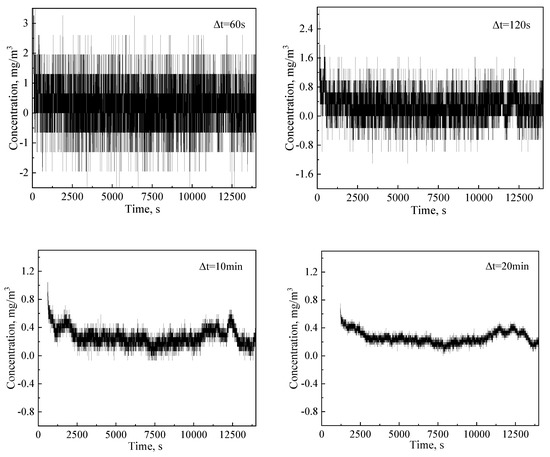 PM2.5 concentration calculated with intervals of 60 s, 120 s, 10 min, and 20 min.