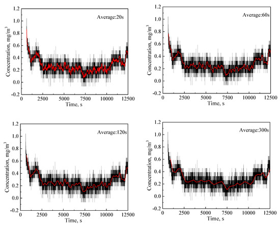 In order to further eliminate the influence of pressure oscillation and prevent the output of the monitor from being an abnormal value, the concentration calculation results (Δt = 10 min) were also averaged every 20 s, 60 s, 120 s, and 300 s, as shown in Figure 6. It can be seen that the averaged concentration (red line) is much more stable, and the oscillation becomes weaker as the average time increases. However, the details of curves lose a lot when the average time is too long. Therefore, the concentration data are suggested to average every 120 s before output by the pressure-based PM2.5 monitor in a similar environment.