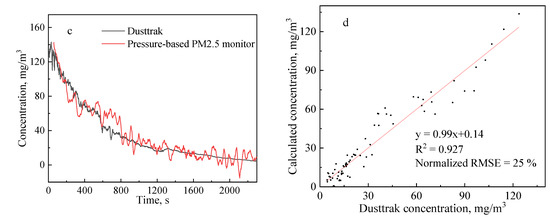 Figure 7c shows the comparison between PM2.5 concentrations calibrated by the pressure data using Equation (10) and those recorded by Dusttrak. The calculated concentrations are in good agreement with the Dusttrak data. Both of them declined with time, and the decreasing rate gradually slowed down, which is consistent with the environmental conditions of this experiment. Figure 7d shows a linear regression for PM2.5 mass concentration between the pressure-based PM monitor and Dusttrak, with an R2 of 0.92 and normalized RMSE of 25%. As a low-cost sensor, the pressure-based PM2.5 monitor still has good performance on measurement of high-concentration PM.