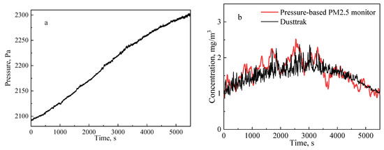 Figure 7a shows variation of pressure with time recorded by the pressure-based PM2.5 monitor. After large particles were separated by a cyclone collector, PM2.5 was deposited on the filter membrane, and the pressure increased steadily from 2214 to 2466 Pa with time. Resulting from the high PM concentration in the chamber, the pressure curve is smoother, with less oscillation. As time increases, the slope of pressure-time curve decreases due to the decline in environmental particle concentration. This phenomenon was proved by data of Dusttrak, in which PM2.5 concentration decreased from 143 to 4 mg/m3, as shown in Figure 7c.
