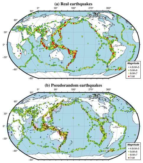 The global distribution of real earthquakes (a) and pseudorandom earthquakes (b).