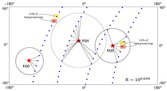 The considered earthquake database includes 20,547 earthquakes with M ≥ 4.8 occurring from 2005 to 2010 (U.S. Geological Survey: http://www.usgs.gov, accessed on 1 May 2021). The aftershocks in the list of earthquakes are carefully removed by characterizing the occurrence time and its associated area of main shock. That is, for a given earthquake in the list, any other earthquake that occurred inside the area of 2° × 2° centered on the epicenter and within 15 days after its occurrence time is systematically removed from the list (see the detail in Yan et al. []). After this, 10,320 earthquakes (EQs) are remaining in the list. The global distribution of these EQs is shown in Figure 1a.