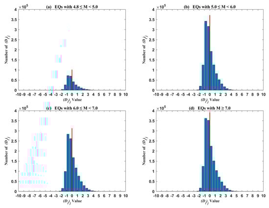 The histogram of the (Di)j values obtained from earthquakes with different magnitude is presented in Figure 3. For the four subpanels from earthquakes with different magnitudes in Figure 3, the distribution of negative (Di)j is roughly Gaussian, whereas the distribution of positive one is obviously not Gaussian. As discussed by previous research, if earthquakes would have no effects on the ionospheric ion density, then the statistics of Ni should be similar to the statistics of the ion density measurements used to build the background maps and, in such a case, the (Di)j distribution should be Gaussian-like []. Therefore, non-Gaussian-like positive (Di)j is probably affected by other factors, such as an earthquake. In addition, regarding some LAIC models an anomalous statistical increase in the ionospheric ion density above earthquakes is favored at the altitude of DEMETER [,,]. Therefore, the positive (Di)j is of interest for our study. It should be noted that the amount of data in Figure 3a is obviously less than others because the Dobrovolsky’s radius R is small for earthquakes M < 5.