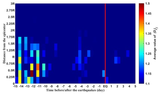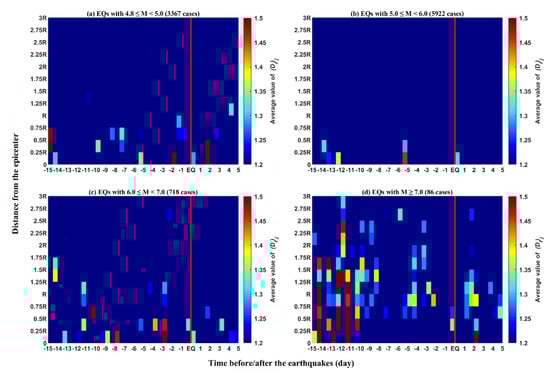 Figure 4 represents the final statistical results from 10,093 earthquakes with M ≥ 4.8. It is noted that due to strict data selection, there may be earthquakes for which there are no data available and the final number of earthquakes used for statistical analysis will be smaller than the number of earthquakes in the main earthquake list. In Figure 4, more perturbations are observed from 10 days to 15 days before the EQ occurrence time. At the same time, 3–5 days before the earthquake was another period of significant disturbance. In addition, the postseismic effect is obvious. The apparent position of disturbance can extend to 1.75R.