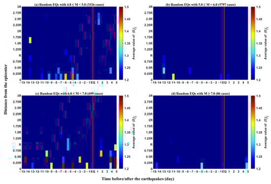 The statistical results of random earthquakes can prove that the statistical results of real earthquakes are reasonable and reliable from another point of view, as shown in Figure 6. It can be seen that there is no postseismic phenomenon at all. In addition, with an increase in magnitude, the intensity and range do not regularly change. Especially for the statistics of earthquakes with M ≥ 7 in Figure 6d, there is barely any disturbance observed, which is obviously unreasonable. Meanwhile, because the same amount of data and earthquake cases are used in Figure 5 and Figure 6, it can also be explained that the abnormal phenomenon in Figure 5 is not caused by the difference in the amount of data used for the statistics. When we selected the data related to the random earthquake, the regularity of the data related to the real earthquake may be scrambled and the time and location of the abnormal phenomenon will not be concentrated. As a result, the statistical anomalies of random earthquakes (Figure 6) are weaker than those of real earthquakes (Figure 5).