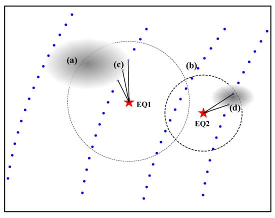 Schematic map of relative position between satellite orbit and seismic ionospheric anomaly, showing the datapoints on the orbit (blue dots), earthquake epicenters (red star), the areas of Dobrovolsky’s radius R around epicenters (dashed circles), and presumed anomalies (gray shadows). (a–d) in the figure represents different states of the relationship between anomaly position and data acquired. See details in the text.