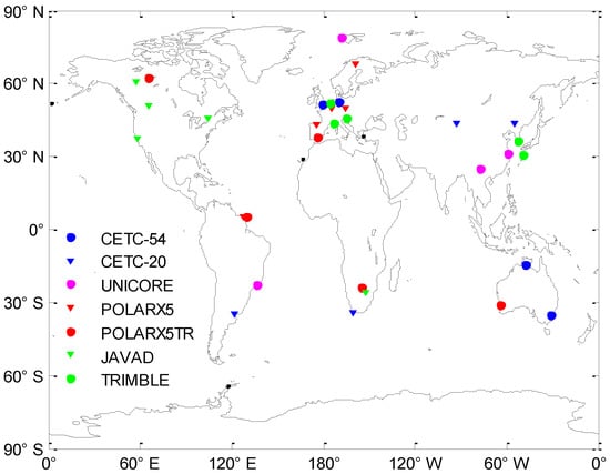 Observations from three Chinese GNSS equipment manufacturers were collected, i.e., Beijing Unicore Communications Incorporation as well as the 54th and 20th Research Institute of China Electronics Technology Group Corporation (CETC-54, CETC-20), all of them are multi-frequency and multi-constellation receivers which can offer joint GPS, GLONASS, Galileo, BDS-2 (B1/B2/B3) and BDS-3 (B1I/B3I/B1C/B2a) tracking. Furthermore, four types of receivers widely used in the Multi-GNSS Experiment (MGEX) stations are also analyzed. All 32 stations provide 1-s sampling rate data and are equipped with external high precise atomic clocks except Unicore receivers. The distribution of tracking stations is shown in Figure 2. The information of receivers is listed in Table 2.