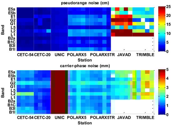 To analyze the observation noise, 1-s sampling rate data of stations list in Figure 2 from DOY 001, 2021 to 080, 2021 are processed. Figure 4 shows the pseudorange and carrier-phase noise of all stations and all signals.