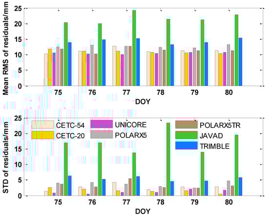 The RMS of the post-fit residuals of IF carrier-phase phase observations derived from the GPS POD are illustrated in Figure 6. For each receiver, the mean RMS and STD of the seven receiver types are shown for comparison: CETC-54(9), CETC-20(4), UNICORE(4), POLARX5(57), POLARX5TR(14), JAVAD(32), TRIMBLE(27). The number of stations is given in parentheses. Carrier-phase residuals ranges from 7 to 20 mm for most receivers and the differences among receivers are obvious. For different receivers, JAVAD receivers have larger residuals, with a mean STD of about 15 mm, which is more than twice the STD of other receivers. Carrier-phase residuals of TRIMBLE receivers are about 15 mm. The other five receivers are rather close and show smaller residuals of about 12 mm. The difference between the same type of receivers is most likely affected by the environment-related external errors of stations.