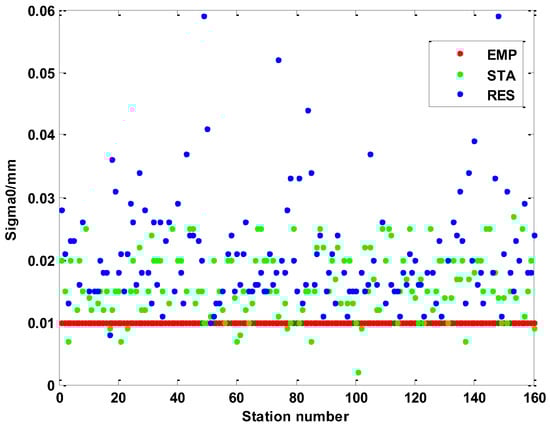 Figure 7 compares the priori variance factor  in Equation (6) of all stations based on different stochastic models on DOY 078. It is noted that the  is for the IF carrier-phase combination. For the EMP model, the value is 6.1 mm for all stations, and it is based on the assumption that the observation accuracy of both signals is 0.1 cycle. For the STA model, values range from 5 to 15 mm for most stations. The variation range is much larger on different stations for the RES model, and the large values of some stations may be caused by external errors.