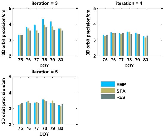 The 3D RMS of the three stochastic models compared with the IGS final products is illustrated in Figure 8. The difference between the fourth and fifth iterations is within 0.1 cm, and the 3D RMS of the third iteration is larger. For different stochastic models, the STA and RES models bring almost no improvement on the fourth and fifth iterations compared with that of the EMP model. From this point of view, it can be concluded that the orbit qualities based on three stochastic models can all reach an accuracy of 3.5 cm when the number of iteration times is sufficient. It is clear that the orbit accuracy is different between different models on the third iteration, and STA and RES models bring improvement compared with that the EMP model.