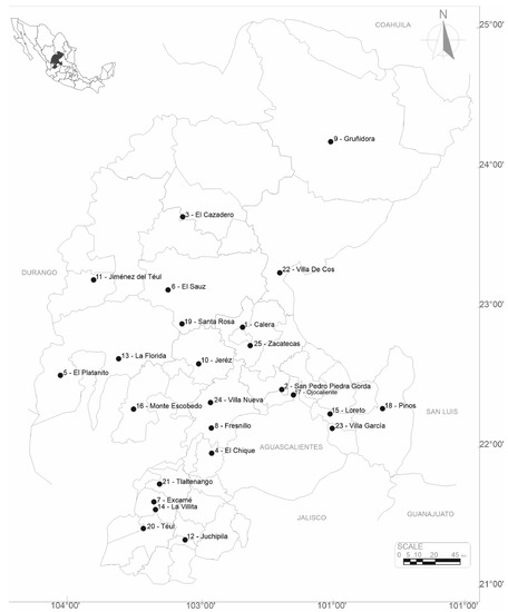 Study region of Zacatecas state within the Mexican territory.