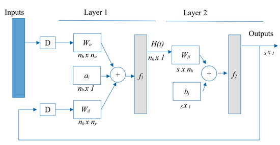 The weight of the connection between the input neuron u(t − r) and the ith hidden neuron is defined as wir. The connection weight between the ith hidden neuron and output feedback neuron y(t − l) is wil; the bias of the ith hidden neuron is ai; the hidden layer activation function is f1 and the hidden transfer and output function is f2.