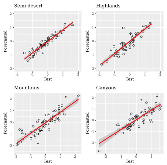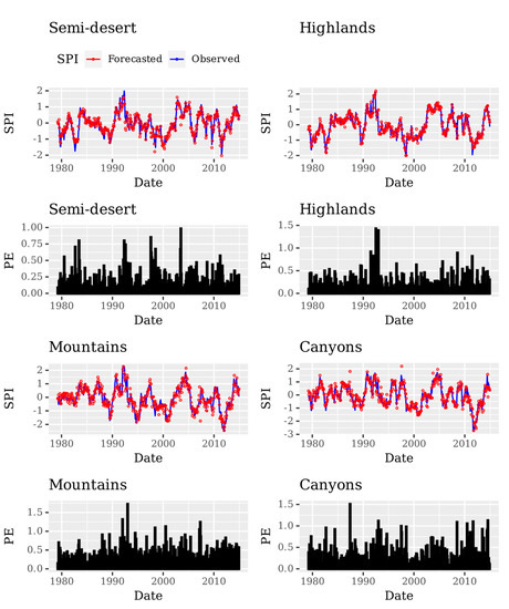 The probability under normal distribution of the prediction error of the NARX models is summarized in Table 5 and shows the under-predictions (PE < 0) and the over-prediction (PE > 0) skills. An error will be zero when the predicted SPI value exactly matches the SPI observed value [37,38]. Our results indicate that PE < 0 occurrences are higher than PE > 0 occurrences for all but Semi-desert regions. Those results suggest that ANN models under-predicted the SPI for all but the Semi-desert region, where the largest difference found was for the Canyons region with a probability of 58.58% and the smallest difference of 49.65% was found for the Semi-desert region. In addition, the minimum probability value of over-prediction with 41.42% was found for the Canyons region and the maximum probability value of over-prediction error was found for the Semi-desert region with 50.35%. Those results provide support to the ones described by summarized statistics of the linear models between the predicted and the observed SPI values (Table 4).