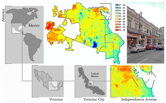 Location of the case study, map of isotherms (values in °C) of the superficial urban heat island of the metropolitan area of Veracruz and Boca del Rio on 4 May 2017, and photograph of the area.