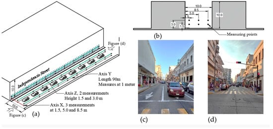 On the X-axis, the number of measurements was determined by the number of lanes; however, a minimum of three points is considered, with two located on the sides of the facades at 1.5 m and one at the middle of the street. On the Z-axis, the number is defined according to the levels; in this case, two points with a height of 1.5 and 3.0 m are considered. On the Y-axis, the number of data was determined by the length of the urban canyon and flight time of the drone, considering a measurement every 1 m giving a total of 91 data. In the end, the total of measurements between the three axes (X = 3, Z = 2 and Y = 91) per day were 546 data, values that were later taken for the validation of the model (see Figure 2).