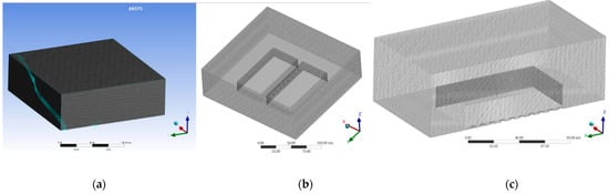 Geometry and grid generation was executed with the pre-processors design modeler and fluent meshing in the ANSYS workbench, resulting in a grid with 2,060,565 nodes, 1,994,508 elements, and 720,000 cells, respectively. The selected configuration is based on its perfect adaptation to the geometry of the simulation domain, and an example can be found in [45] (Figure 3c). The resolution of the grid went through a sensitivity analysis, in quality from coarse to fine (120,000 to 1,680,000 cells), where results show a difference of less than 0.5%. A total of 500 iterations were run to converge in the solution or have residuals less than 10−3 in the values, according to the criteria provided in the ANSYS theory references [44].