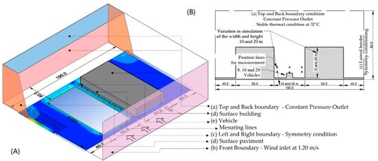 A 3D model was made of the urban canyon delimited by two city blocks. The computational domain is defined by dimensions of 190 × 180 × 60 m (length, width, and height); the featured rectangular prisms (city blocks) of 100 (length) × 50 m (width) have varying height values of 10 and 20 m. The width of the canyon, that is, the separation between both prisms, also varies from 10 to 20 m, resulting in two aspect ratios H/W (height of buildings divided by the width of the street) in the simulations. Additional geometry was defined for the motor vehicles (cars), with dimensions of 4.0 × 2.0 × 1.5 m3 (Figure 3a).