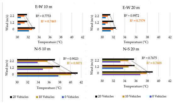- The number of cars in the case studies (10 and 20 units) did not affect the decrease in temperature with wind speed at 1.2 m/s, where the E–W orientation decreased mostly by 1.5 °C and N–S-oriented lane decreased within a range of 3.3 to 4.6 °C.