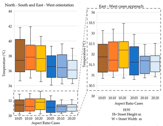 A study that supports our findings related to the power of convection to mitigate heat flow in the urban canyon was conducted in Seoul (South Korea), supported by 54 automatic weather stations. It was evaluated that, in clear skies, the effect of the wind in the high peaks of UHI increased the wind speed results by 0.5 m/s, on average; with a decrease of 0.2 ◦C in UHI, compared to our results (Table 5), it was observed that the trend was mainly achieved in the canyons with N–S orientation (Figure 7), where reductions oscillated between 0.74, 0.52, and 0.49, respectively.