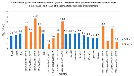 The simulations set in the month of June, in the warm period, with E–W orientation, are below the average for American cities; alternately, the simulations with N–S orientation showed an increase of 10 units equal to the value determined for these cities, but it was doubled (10.2 W m−2) with 20 units, that is, with a full capacity for a 100 m long urban canyon. The values in the field measurements in the month of February (semi-warm period) at the height of 1.5 m rose from 8.5 to 7.6 W m−2 (double) but were equal to the height of 3.0 m with the values of Sailor et al. [26].
