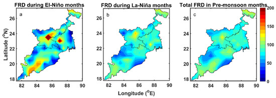 We analyse the variations in the flash rate density (FRD, flashes) and rainfall for the El-Niño episodes of 1998, 2006, and 2010 and for the La-Niña episodes of 1999, 2000, 2008, 2009, 2011, and 2012 during the pre-monsoon months. The FRD variations during the El-Niño periods are shown in Figure 2a, the La-Niña periods in Figure 2b and the total FRD in Figure 2c. The FRD analysis (Figure 2c) shows that the study regions have high flash rates over a few areas: southern and northern Odisha, central Jharkhand, and northern parts of West Bengal. The FRD was more prominent during the El-Niño period (Figure 2a). The highest FRD was observed over the north, central, and west regions of West Bengal, whereas for Odisha, high values were recorded over the southern, central, and northern regions. The observed high FRD regions of central Jharkhand during the total period (Figure 2c) shifted to the southern and north-eastern parts of Jharkhand during the El-Niño period. Although the higher FRD regions were active even during the La-Niña years, the intensity decreased over all the significant areas, except the central parts of Jharkhand (Figure 2b), where the FRD was highest (>180). The anomaly plots of FRD (from El-Niño, La-Niña, and average plots) supported the observation of high/less FRD during El-Niño/La-Niña years (Figure 3a,b).