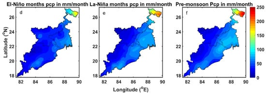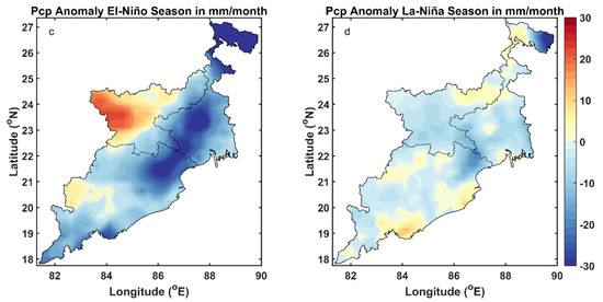 The accumulated precipitation variations during El-Niño (Figure 2d), La-Niña (Figure 2e), and total El-Niño/La-Niña years (Figure 2f) per season during pre-monsoon months are shown in Figure 2. The overall rainfall patterns were similar for both El-Niño and La-Niña periods, where the highest intensity was over the northern (Darjeeling, Jalpaiguri, Cooch Behar) West Bengal region, with higher precipitation over northern (Mayurbhanj, Kendujhar, Balasore) Odisha and some parts of western (West Medinipur, Bankura) and north (Darjeeling, Jalpaiguri, Cooch Behar) West Bengal regions. The seasonal precipitation anomaly for El-Niño (Figure 3c) and La-Niña (Figure 3d) for the study period during pre-monsoon months was plotted. For the El-Niño years (Figure 3c), except for a few regions of western Odisha (Nuapada, Balangir, Kalahandi), all other regions showed negative anomalies. In Jharkhand, except for the north-eastern, southern, and south-eastern parts, the other regions showed a positive anomaly. However, for West Bengal, all the regions showed a negative precipitation anomaly. The highest negative anomaly was observed over the northern Odisha (Mayurbhanj, Balasore, and Kendujhar districts) and western (Bankura, Purulia, West Medinipur, Jhargram) and northern parts (Darjeeling, Jalpaiguri, Cooch Behar, Alipurduar) of West Bengal. In the case of La-Niña, a similar precipitation pattern was visible with a higher magnitude. The anomaly plots show considerable precipitation (Figure 3d) in some parts of eastern Indian states. Though the precipitation difference in both El-Niño and La-Niña periods was not noteworthy, the region experienced higher precipitation during La-Niña.