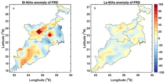 - The lightning FRD was higher during the El-Niño period over most of the study region. During El-Niño, the FRD anomalies were positive over parts of Odisha (southern, central, and northern), West Bengal (northern, some parts of western and eastern), and Jharkhand (central, southern, and some parts of north-eastern and western). Other regions of all three states showed negative anomalies during El-Niño. The La-Niña periods showed less FRD (negative anomalies) than the El-Niño ones.