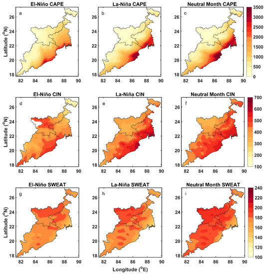 Variation of CAPE (a) El-Niño, (b) La-Niña and (c) Neutral months (first row), CIN (d) El-Niño, (e) La-Niña and (f) Neutral months (second row), and SWEAT (g) El-Niño, (h) La-Niña and (i) Neutral months (third row) during the pre-monsoon season from 1998–2014.
