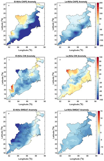 Figure 5 shows the anomalies of CAPE, CIN, and SWEAT during the El-Niño and La-Niña period from 1998 to 2014. During El-Niño, except for the Nuapada and Balangir districts of Odisha, all other parts showed a negative anomaly of CAPE (Figure 5a). Except for northern West Bengal districts (Darjeeling, Kalimpong, and parts of Jalpaiguri), all other regions showed a negative anomaly of CAPE. In Jharkhand, except for parts of north-eastern and south-eastern Jharkhand districts, other regions showed a positive anomaly during the El-Niño phase. The negative anomaly values, indicating reduced CAPE values over the Odisha, West Bengal, and north-eastern and south-eastern parts of Jharkhand during El-Niño, persisted even during the La-Niña period. However, most of the eastern India region showed a negative anomaly, except some parts of the western West Bengal district and parts of north-eastern Jharkhand, which showed a slight positive anomaly value during La-Niña (Figure 5b). The spatial variability shows that CAPE values were lower over Odisha and West Bengal during the El-Niño and La-Niña years, with comparatively higher values over Jharkhand.