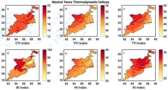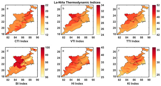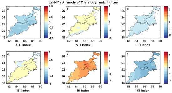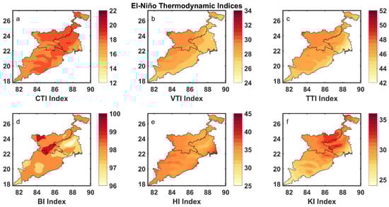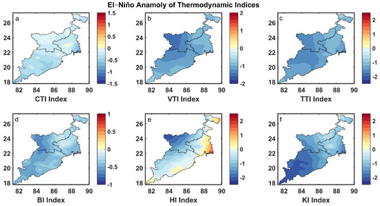 We also analysed other thermodynamic indices (CTI, TTI, VTI, KI, BI, HI) during the El-Niño, La-Niña, and neutral El-Niño/La-Niña periods in the pre-monsoon seasons from 1998 to 2014, as shown in Figure 6, Figure 7 and Figure 8. The CTI values were higher during the El-Niño periods. Apart from CTI, all other indices showed higher values during the La-Niña periods. HI values showed a clear difference between El-Niño and La-Niña and the values were higher during the La-Niña periods (Figure 6, Figure 7 and Figure 8). Figure 9 shows the CTI (a), VTI (b), TTI (c), BI (d), HI (e), and KI (f) anomalies during the El-Niño years, and Figure 10 shows the CTI (a), VTI (b), TTI (c), BI (d), HI (e), and KI (f) anomalies during the La-Niña years from 1998 to 2014. Except for the HI index, all the other indices showed negative anomalies during El-Niño. The HI anomaly clearly differentiates the El-Niño and La-Niña periods over eastern India, with a positive anomaly during the La-Niña for the whole eastern India region (Figure 10). VTI and BI also showed slightly positive anomalies during the La-Niña periods, whereas during El-Niño, a negative anomaly was shown for most of the parts of eastern India. During El-Niño, HI values show negative anomalies, except for the parts of coastal (Ganjam, Puri, Jagatsinghpur, Kendrapara, Balasore) and southern (Malkangiri, Koraput) districts of Odisha, as well as coastal (Purba Medinipur, South 24 Parganas, Howrah), eastern (North 24 Parganas, Nadia, Murshidabad, Hooghly, parts of Purba Bardhaman and Malda), and some parts of northern (Cooch Behar, Alipurduar) districts of West Bengal, which showed positive anomalies.
