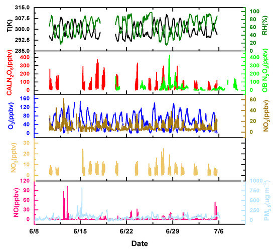 Here, the mixing ratio of N2O5 can be calculated using Equation (7). During the whole nocturnal observation period from June 10th to July 6th, the calculated N2O5 concentrations were relatively high, with a maximum of 374 pptv, which mainly attributed to the high mixing ratio of NO3 and NO2. The mixing ratio of observed N2O5 was measured via CIMS, which showed a high concentration during the period of 27 June to 29 June, with a maximum concentration of 429 pptv. The average concentration of observed N2O5 was 30.5 ± 35.4 pptv.