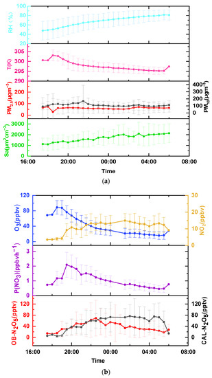 Figure 4a shows the nocturnal profiles for the temperature, humidity, PM2.5, PM10, and Sa. During the nighttime period, the average temperature was 298 K and the maximum temperature appeared at 18:30. The nocturnal humidity increased gradually, with an average value of 68%. The PM2.5 concentration was lower, below 50 μgm−3. Sa also presented a steadily rising trend, with an average value of 1687 μm2cm−3.