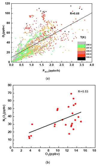 The linear correlation coefficient between P(NO3) and O3 is plotted in Figure 5a. The average temperature was 297.7 K during the nighttime period, and the high temperature promoted NO3 formation. The higher the temperature, the higher the P(NO3), as shown in Figure 5a, which illustrated that the temperature was one of the main factors controlling the NO3 formation. The other two factors, NO2 and O3, also determined the P(NO3). The linear correlation coefficient between P(NO3) and O3 was 0.68, which was higher than for NO2 (R = 0.06). The N2O5 concentration also showed a clear positive dependence on O3 (Figure 5b). This result may imply that the P(NO3) and N2O5 concentrations mainly varied with the O3 concentrations, which could partly explain why O3 varied more rapidly than NO2 during the observation period.