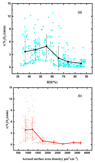 The influencing factors of the N2O5 lifetime were analyzed using the related parameters. When the RH exceeded 55%, the N2O5 lifetime showed a clear negative dependence on RH (Figure 7). The high RH effectively reduced the N2O5 lifetime, indicating that the heterogeneous N2O5 process played a large role as a sink. Figure 7b shows the correlation between the N2O5 lifetime and Sa. Here, the ) rapidly decreased from 4 min to 1 min as the Sa increased up to 1250 μm2 cm−3, but was approximately constant when the Sa increased from 1750 μm2 cm−3 to 3750 μm2 cm−3. The variation trend for the N2O5 lifetime with Sa indicated that the N2O5 uptake rates increased at higher Sa values. The N2O5 uptake was an important part of the N2O5 loss, which was promoted by the high RH and Sa.