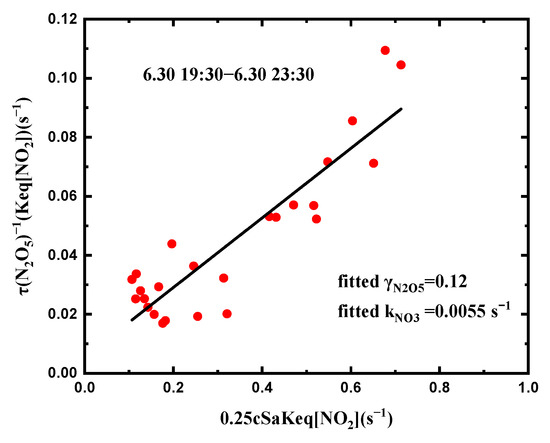 The loss of NO3 was generally divided into two kinds, direct loss pathways caused by the reaction with the VOCs and NO and indirect loss pathways caused by N2O5 heterogeneous hydrolysis. To delve into the loss rates, the N2O5 uptake coefficient was estimated using steady-state methods (Equation (13)) [6]. The linear fits showed the N2O5 uptake coefficient, γN2O5, as the slope and the first-order loss rate coefficient for NO3, kNO3, as the intercept.