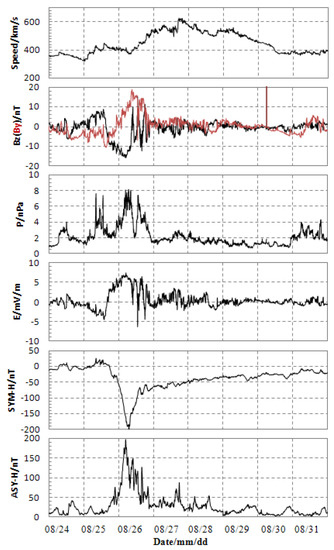The geomagnetic indices curves from 24 to 31 August in 2018 (from top to bottom are respectively flow speed, interplanetary magnetic field (IMF) Bz (black line) and By (red line), flow pressure, interplanetary electric field (IEF) Ey, SYM-H index, and ASY-H index; all these parameters are published at the website of https://omniweb.gsfc.nasa.gov/form/omni_min.html, accessed on 8 August 2022).